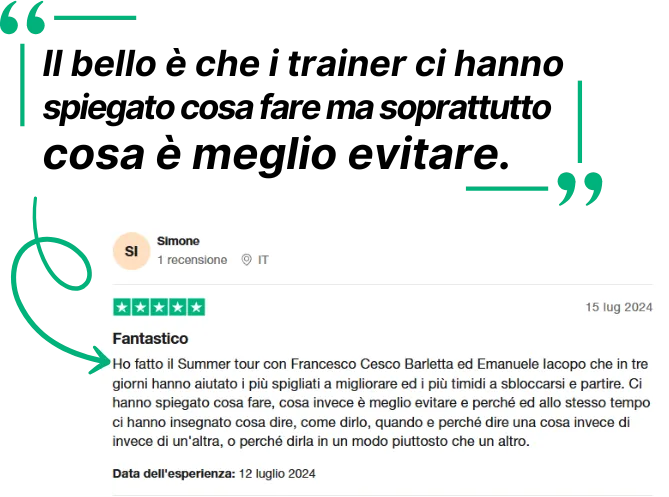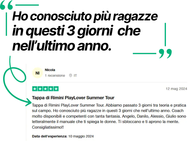 ➡️ 3 Giorni per consolidare le tue abilità – Opzione ideale per chi vuole imparare non solo a conoscere una donna, ma anche a creare interazioni coinvolgenti e memorabili.