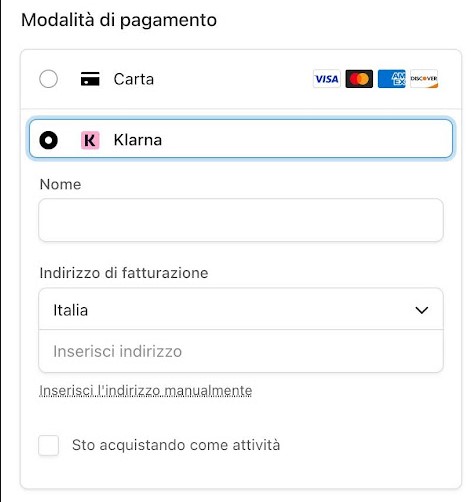 La seconda opzione è quella di pagare con Klarna: